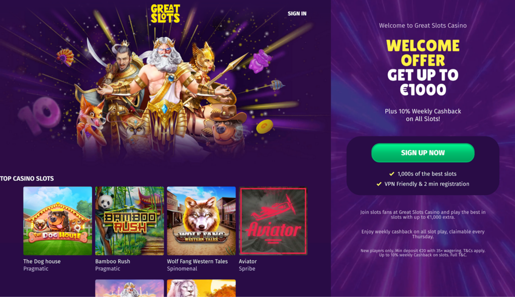 - Great Slotst – 100% welcome bonus up to €1,000 + 10% weekly cashback